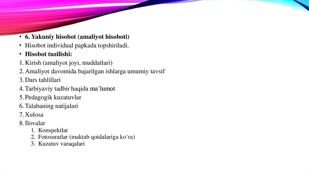 • 6. Yakuniy hisobot (amaliyot hisoboti)• Hisobot individual papkada topshiriladi.
