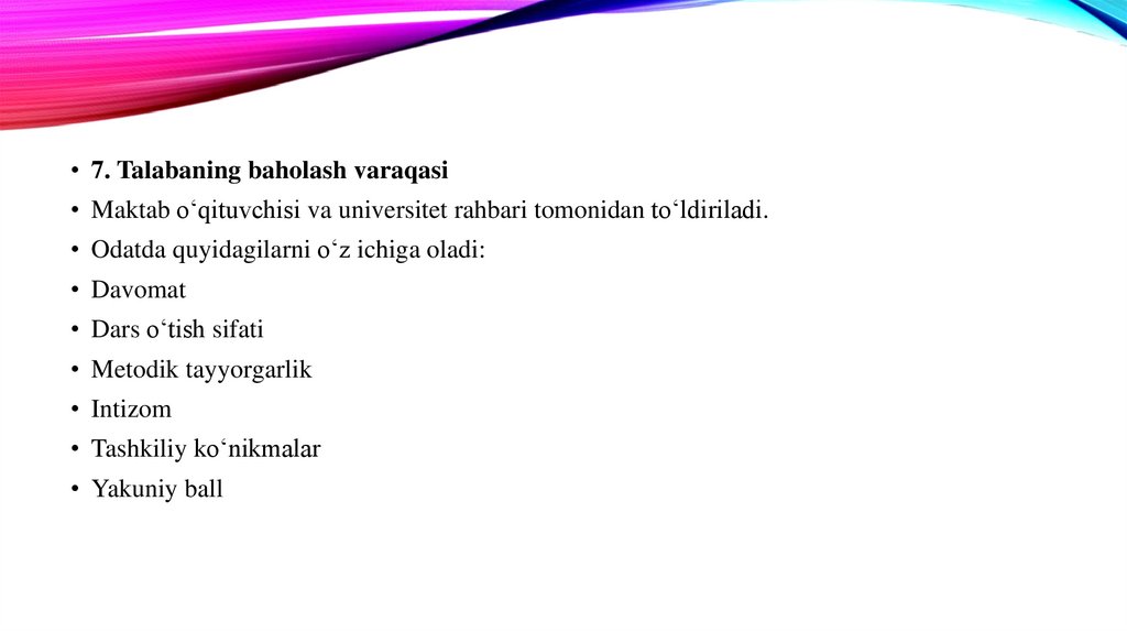 • 7. Talabaning baholash varaqasi• Maktab o‘qituvchisi va universitet rahbari tomonidan to‘ldiriladi.