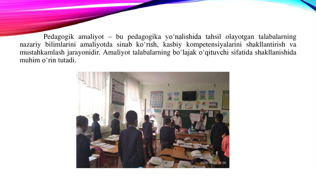 mustahkamlash jarayonidir. Amaliyot talabalarning bo‘lajak o‘qituvchi sifatida shakllanishida