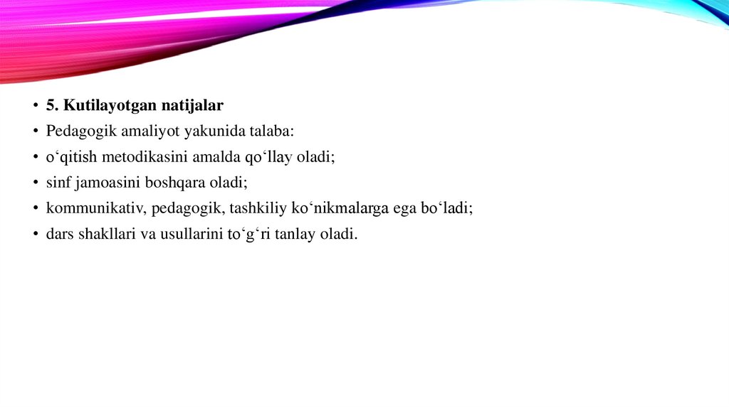• 5. Kutilayotgan natijalar• Pedagogik amaliyot yakunida talaba: