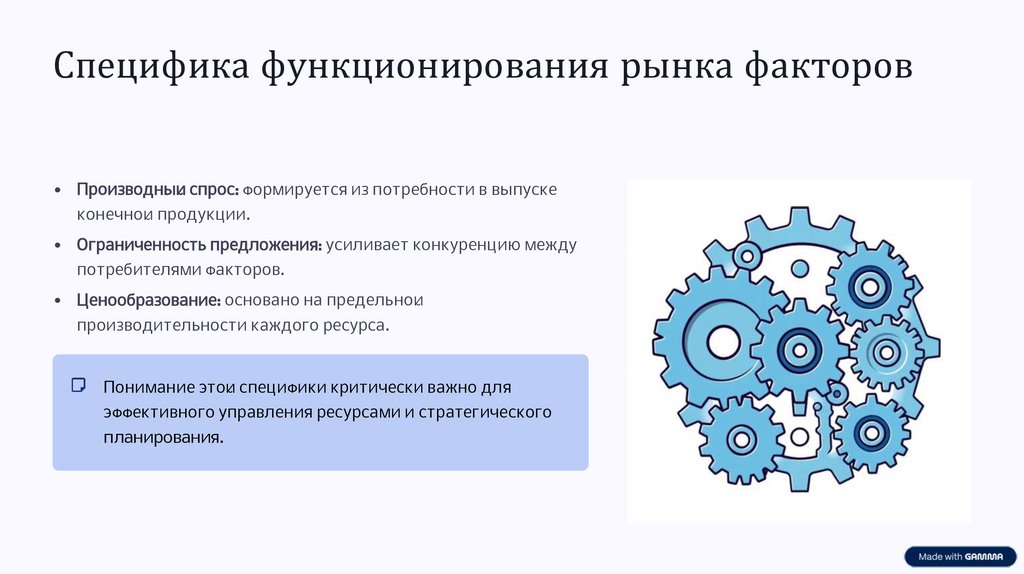 Специфика функционирования рынка факторов• Производный спрос: формируется из потребности в выпуске
