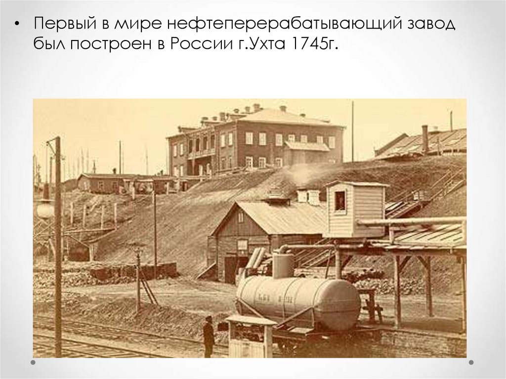 • Первый в мире нефтеперерабатывающий заводбыл построен в России г.Ухта 1745г.