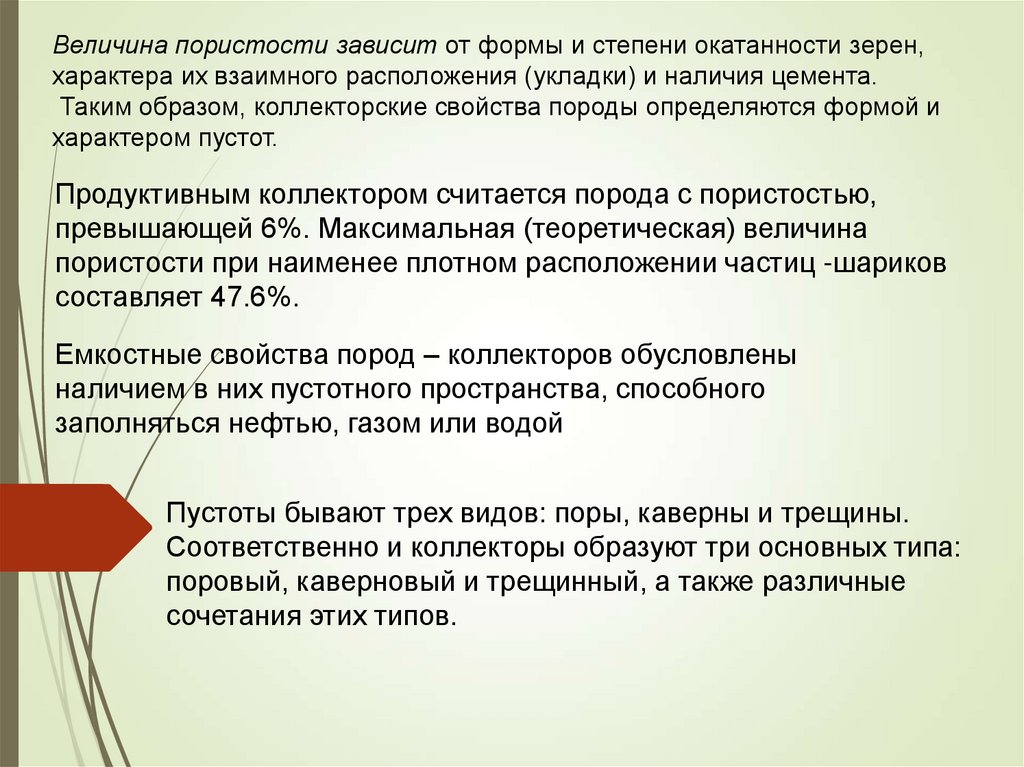 Величина пористости зависит от формы и степени окатанности зерен,характера их взаимного расположения (укладки) и наличия цемента.