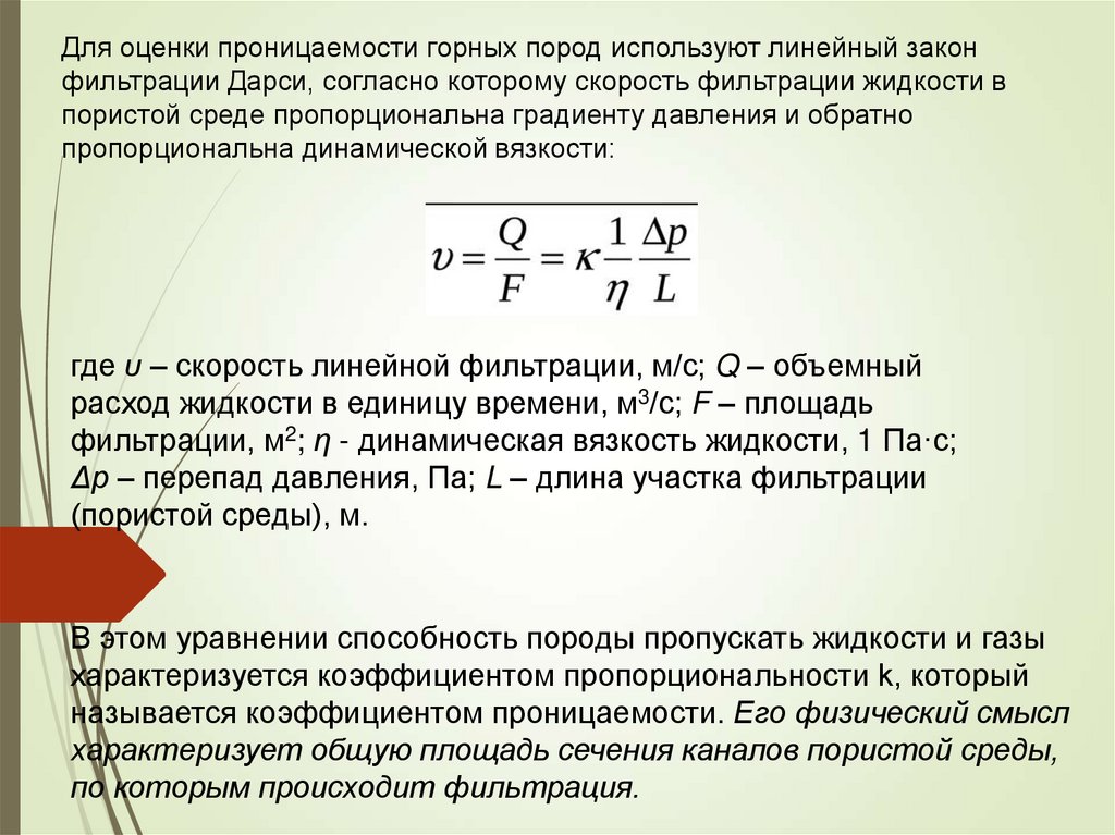 Для оценки проницаемости горных пород используют линейный законфильтрации Дарси, согласно которому скорость фильтрации жидкости в