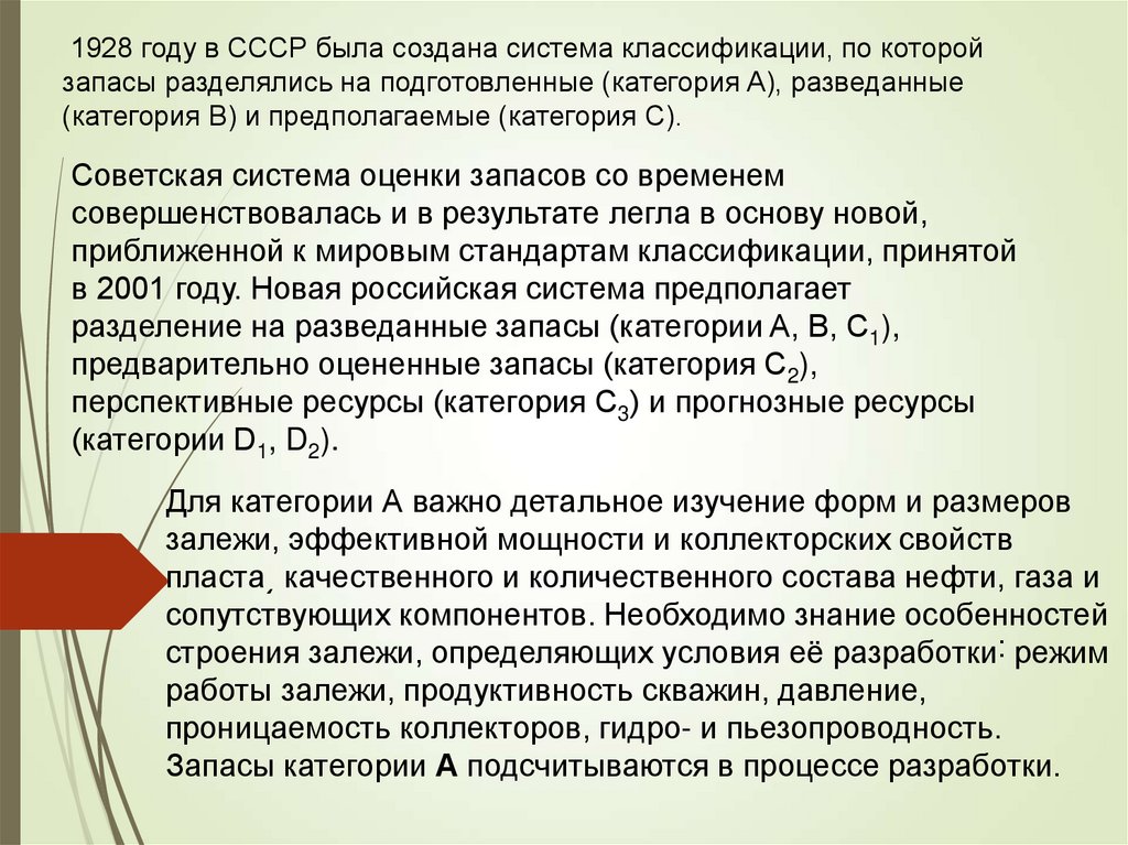 1928 году в СССР была создана система классификации, по которойзапасы разделялись на подготовленные (категория A), разведанные