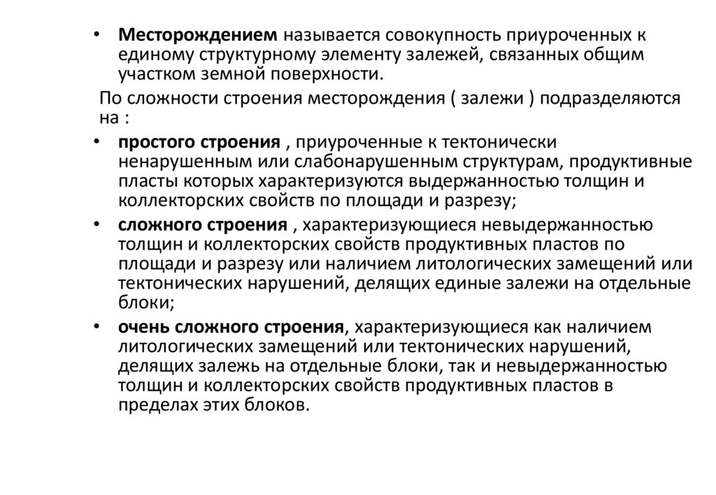 • Месторождением называется совокупность приуроченных кединому структурному элементу залежей, связанных общим