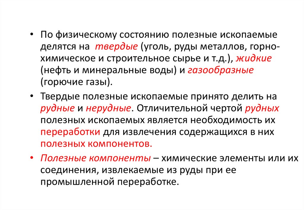 • По физическому состоянию полезные ископаемыеделятся на твердые (уголь, руды металлов, горнохимическое и строительное сырье и т.д.), жидкие