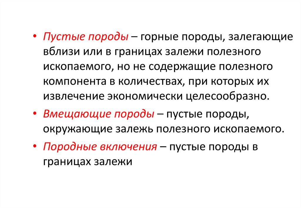 • Пустые породы – горные породы, залегающиевблизи или в границах залежи полезного