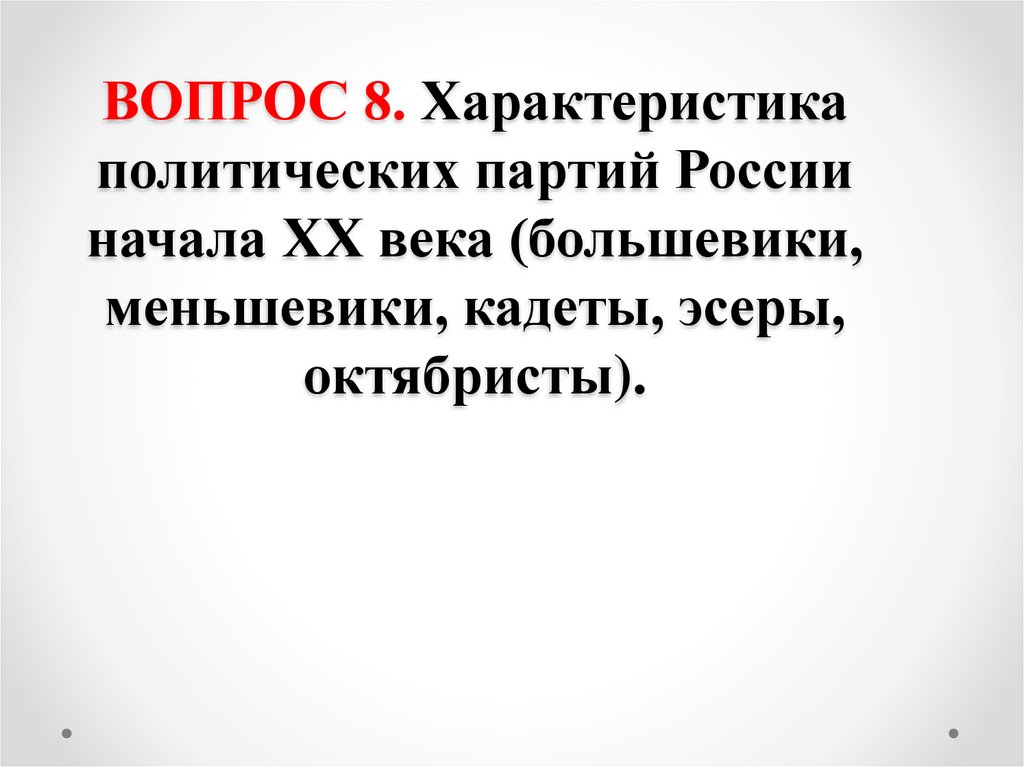 1. ВОПРОС 8. Характеристика политических партий России начала XX века (большевики, меньшевики, кадеты, эсеры, октябристы).