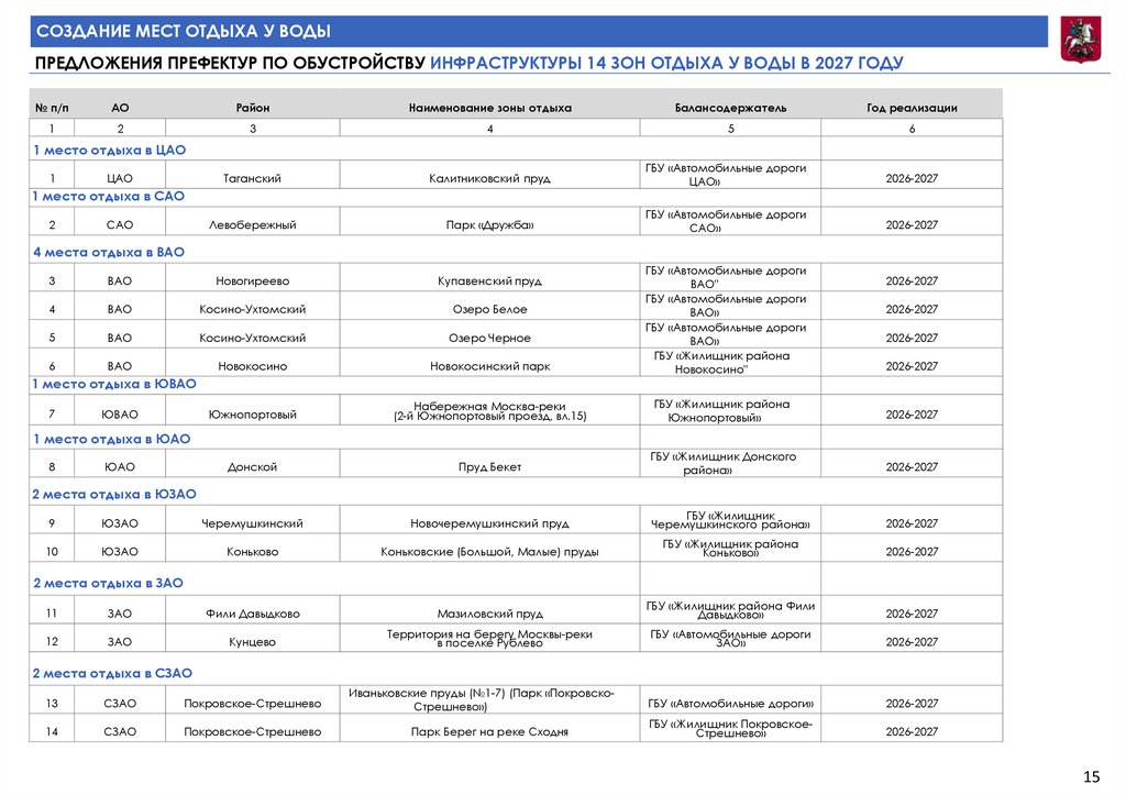 СОЗДАНИЕ МЕСТ ОТДЫХА У ВОДЫПРЕДЛОЖЕНИЯ ПРЕФЕКТУР ПО ОБУСТРОЙСТВУ ИНФРАСТРУКТУРЫ 14 ЗОН ОТДЫХА У ВОДЫ В 2027 ГОДУ