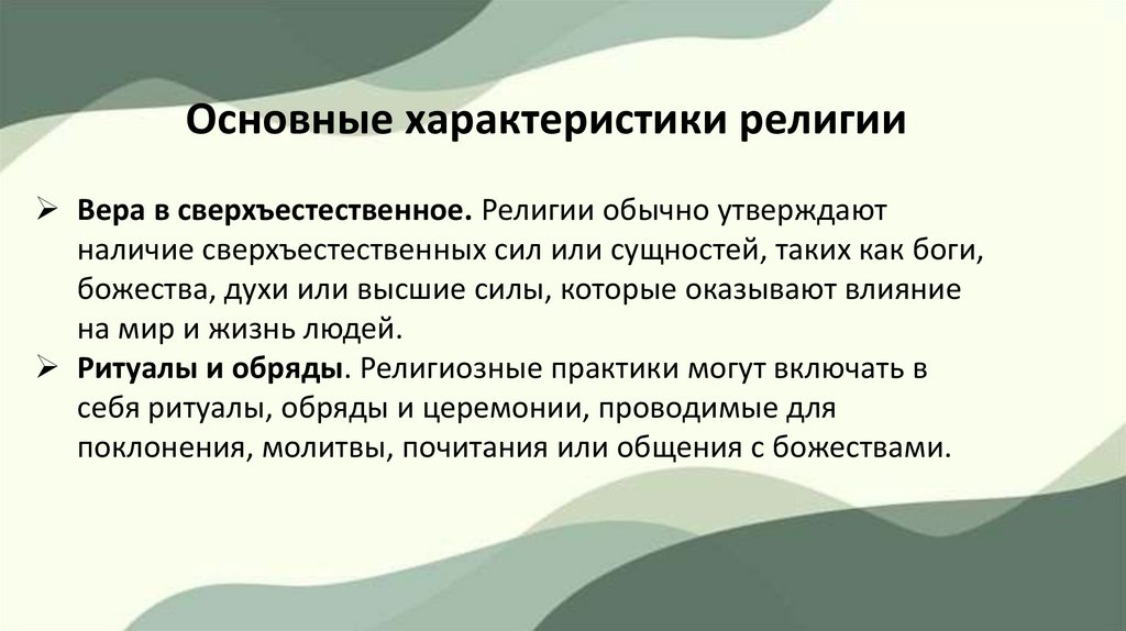 Основные характеристики религииВера в сверхъестественное. Религии обычно утверждают