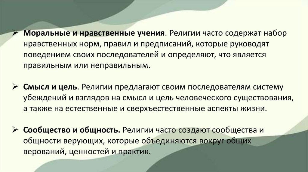 Моральные и нравственные учения. Религии часто содержат наборнравственных норм, правил и предписаний, которые руководят