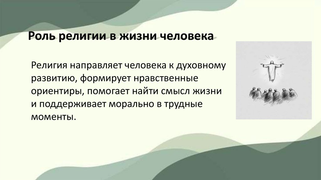 Роль религии в жизни человекаРелигия направляет человека к духовному