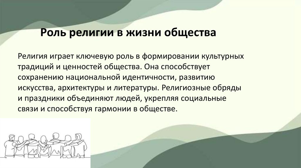 Роль религии в жизни обществаРелигия играет ключевую роль в формировании культурных