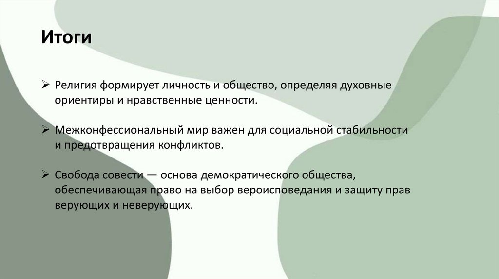 ИтогиРелигия формирует личность и общество, определяя духовные