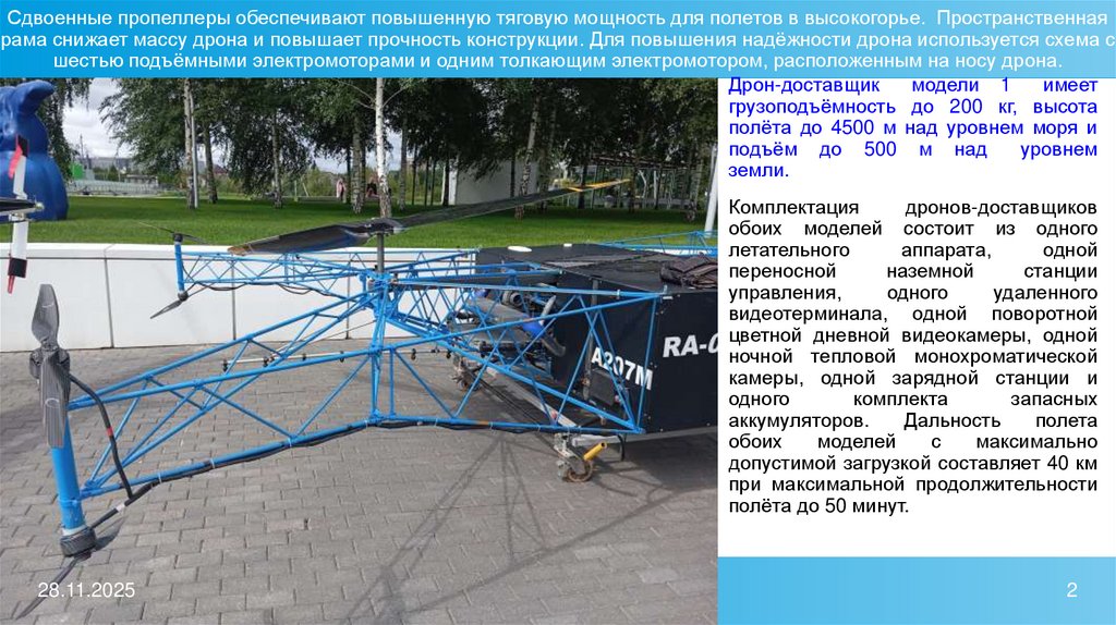 Сдвоенные пропеллеры обеспечивают повышенную тяговую мощность для полетов в высокогорье. Пространственнаярама снижает массу дрона и повышает прочность конструкции. Для повышения надёжности дрона используется схема с