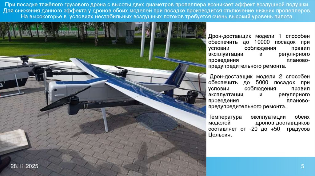 При посадке тяжёлого грузового дрона с высоты двух диаметров пропеллера возникает эффект воздушной подушки.Для снижения данного эффекта у дронов обоих моделей при посадке производится отключение нижних пропеллеров.