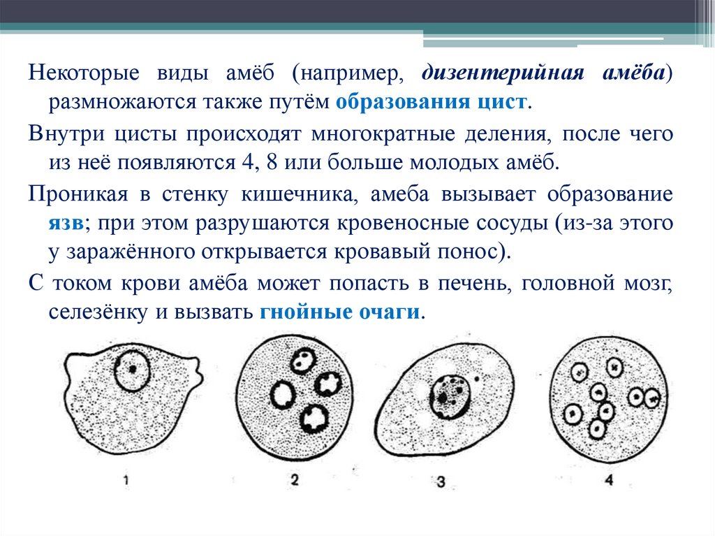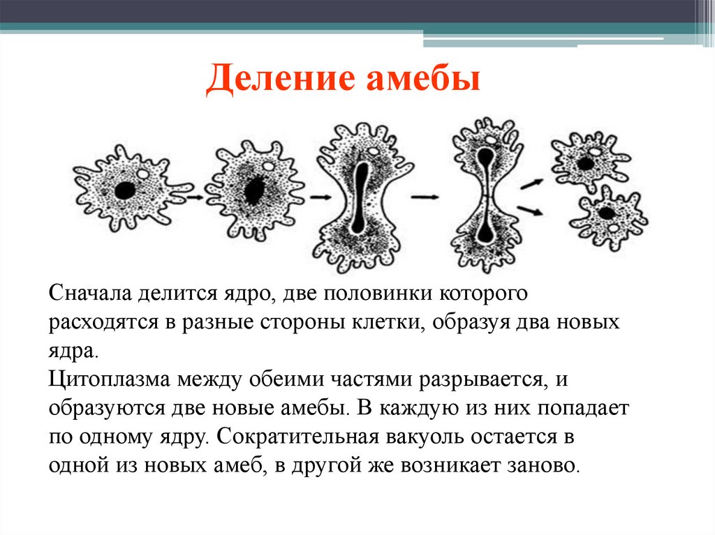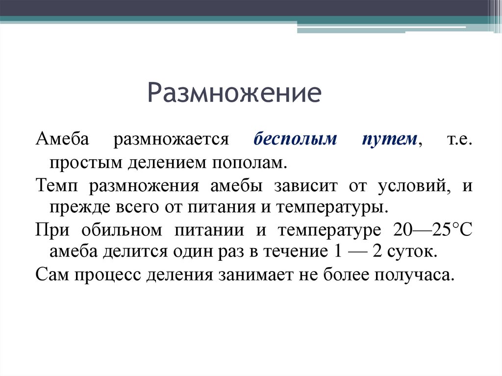 РазмножениеАмеба размножается бесполым путем, т.е.