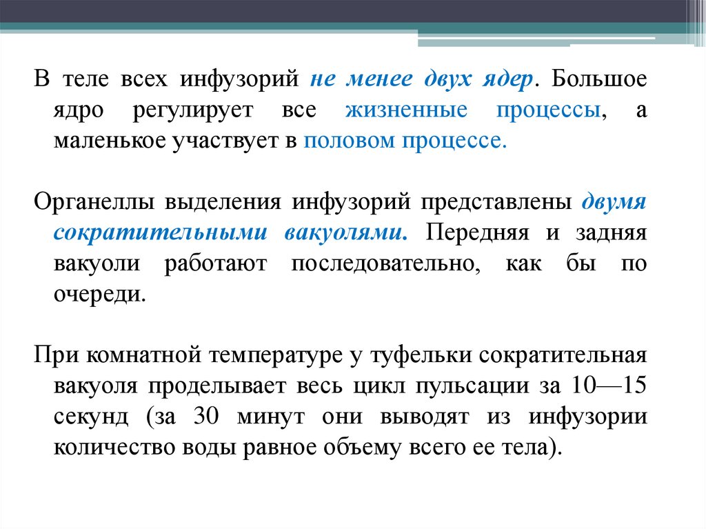 В теле всех инфузорий не менее двух ядер. Большоеядро регулирует все жизненные процессы, а