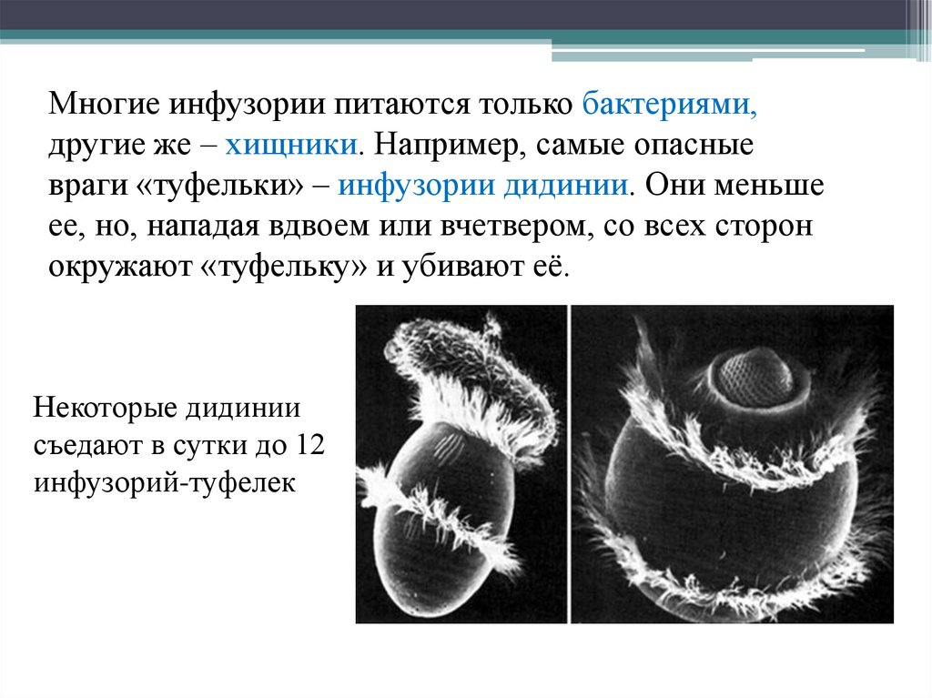 Многие инфузории питаются только бактериями,другие же – хищники. Например, самые опасные