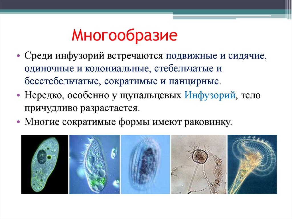 Многообразие• Среди инфузорий встречаются подвижные и сидячие,