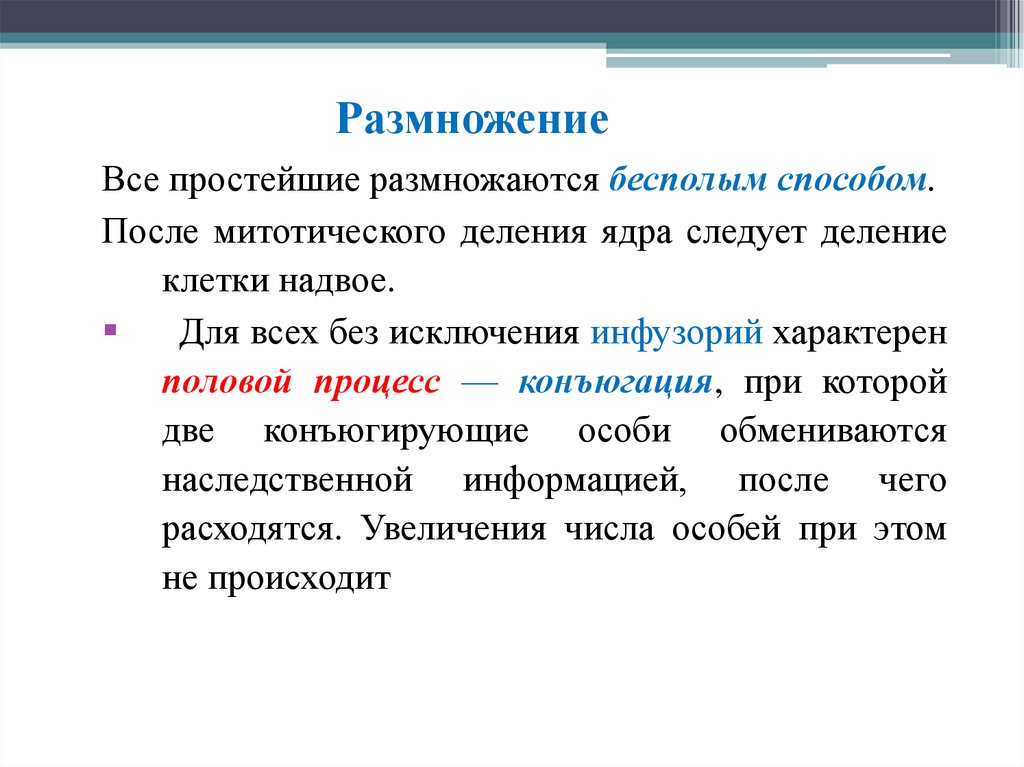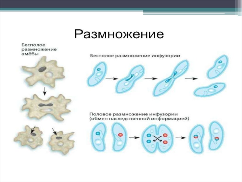 РазмножениеВсе простейшие размножаются бесполым способом.