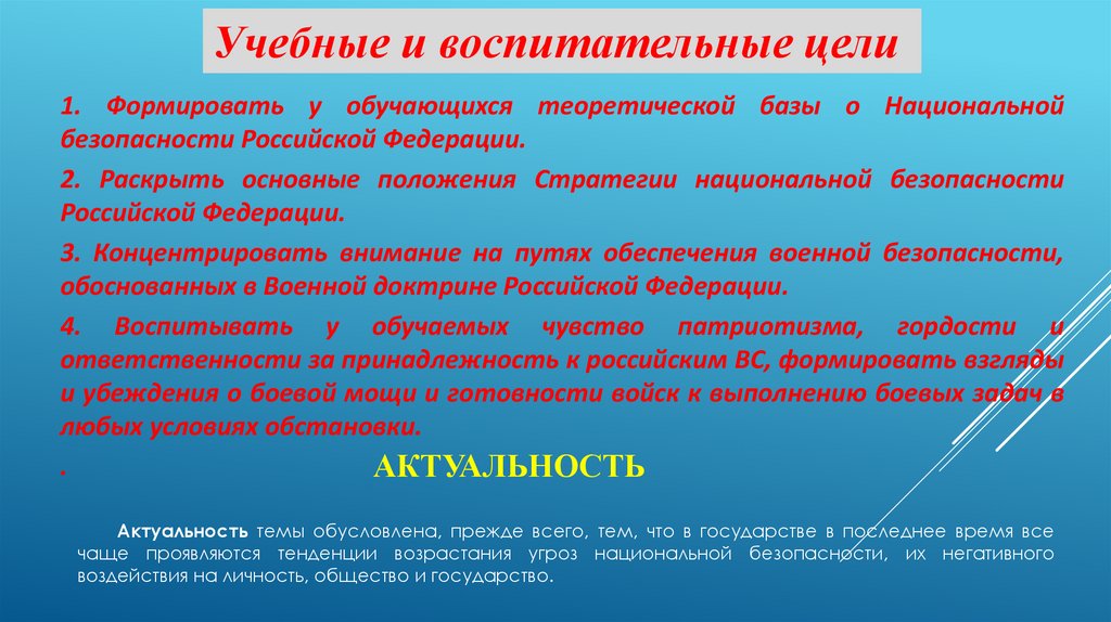 Учебные и воспитательные цели1. Формировать у обучающихся теоретической базы о Национальной