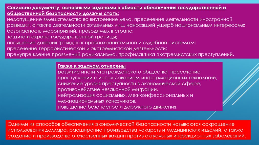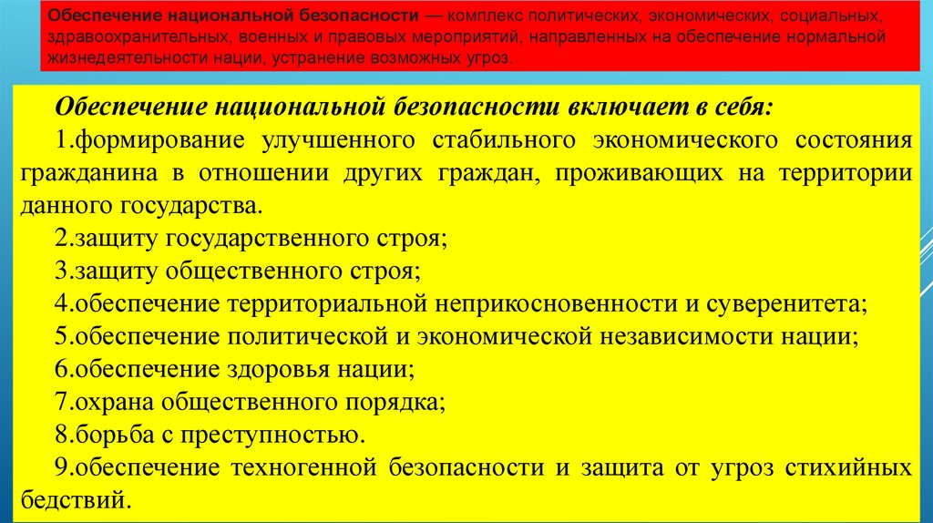 Обеспечение национальной безопасности — комплекс политических, экономических, социальных,здравоохранительных, военных и правовых мероприятий, направленных на обеспечение нормальной