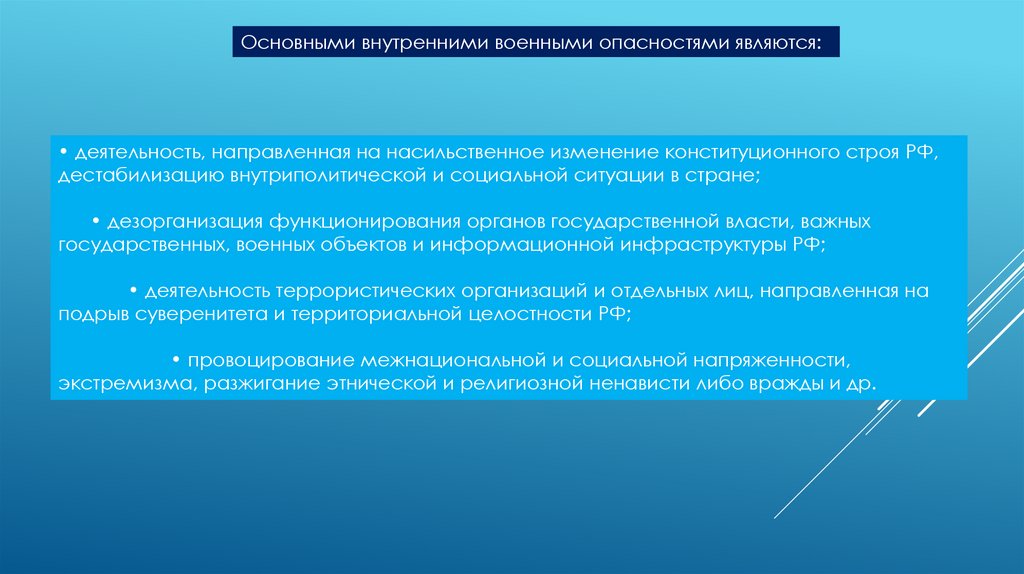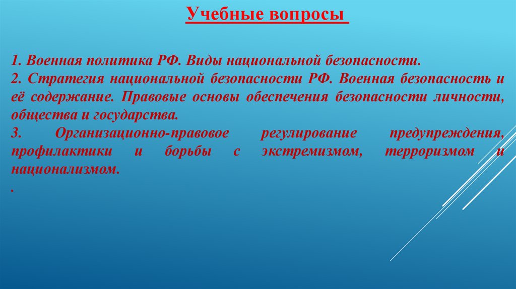 Учебные вопросы1. Военная политика РФ. Виды национальной безопасности.