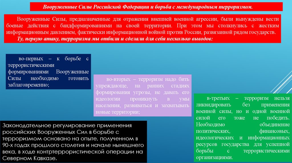 Вооруженные Силы Российской Федерации и борьба с международным терроризмом.Вооруженные Силы, предназначенные для отражения внешней военной агрессии, были вынуждены вести