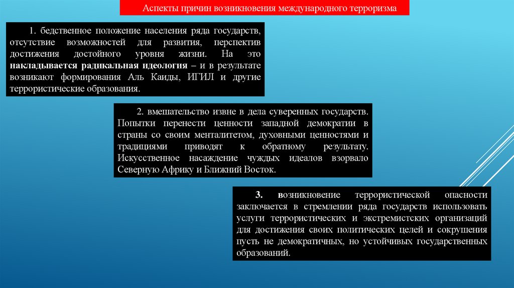 Аспекты причин возникновения международного терроризма1. бедственное положение населения ряда государств,