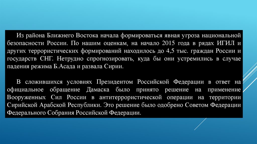 Из района Ближнего Востока начала формироваться явная угроза национальнойбезопасности России. По нашим оценкам, на начало 2015 года в рядах ИГИЛ и