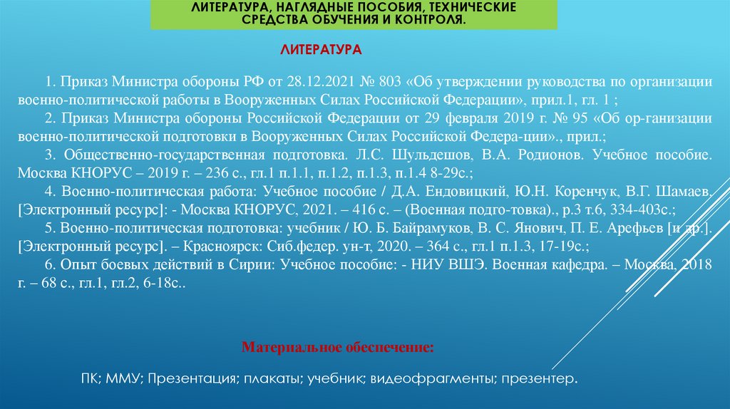 ЛИТЕРАТУРА, НАГЛЯДНЫЕ ПОСОБИЯ, ТЕХНИЧЕСКИЕСРЕДСТВА ОБУЧЕНИЯ И КОНТРОЛЯ.