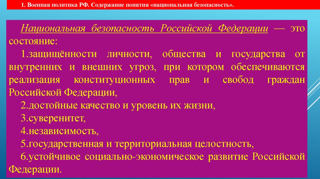 1. Военная политика РФ. Содержание понятия «национальная безопасность».Национальная безопасность Российской Федерации — это
