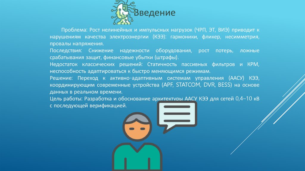 ВведениеПроблема: Рост нелинейных и импульсных нагрузок (ЧРП, ЭТ, ВИЭ) приводит к