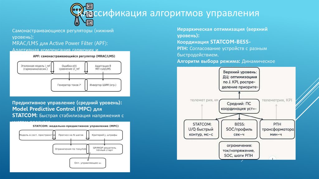 активных фильтров (MRAC/LMS), предиктивное управление STATCOM (MPC) и систему координации разнотипных устройств