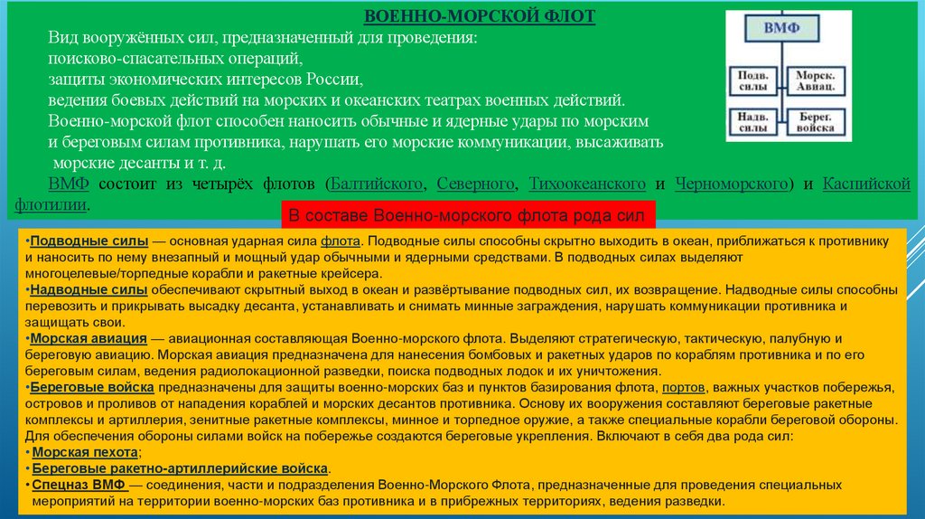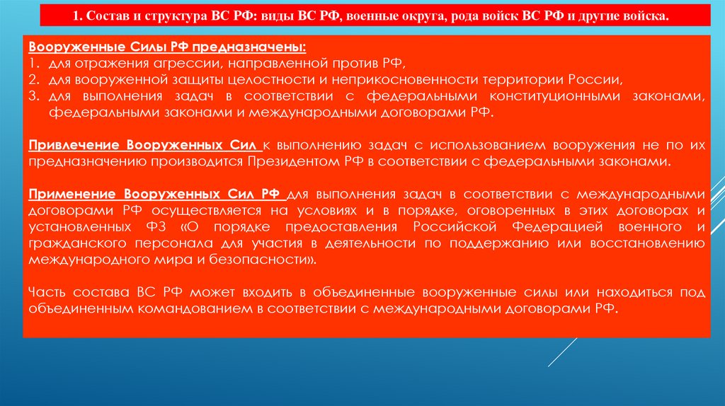 1. Состав и структура ВС РФ: виды ВС РФ, военные округа, рода войск ВС РФ и другие войска.Вооруженные Силы РФ предназначены: