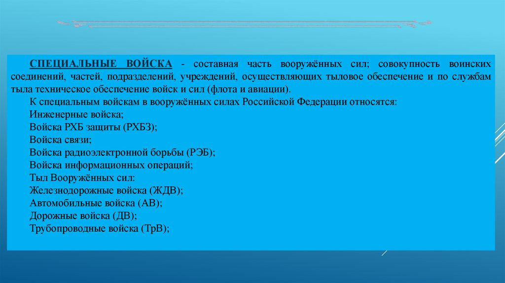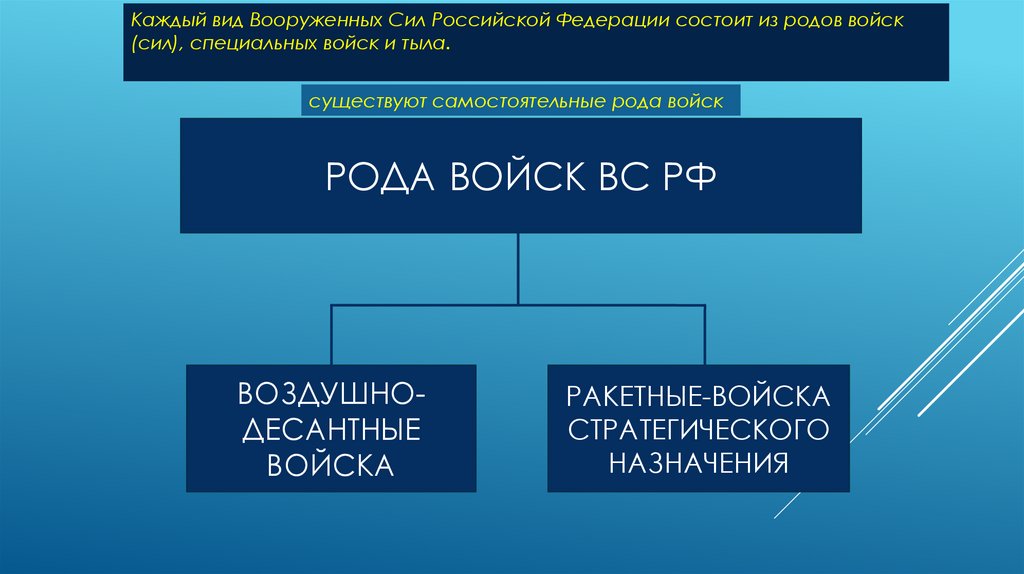 Каждый вид Вооруженных Сил Российской Федерации состоит из родов войск(сил), специальных войск и тыла.