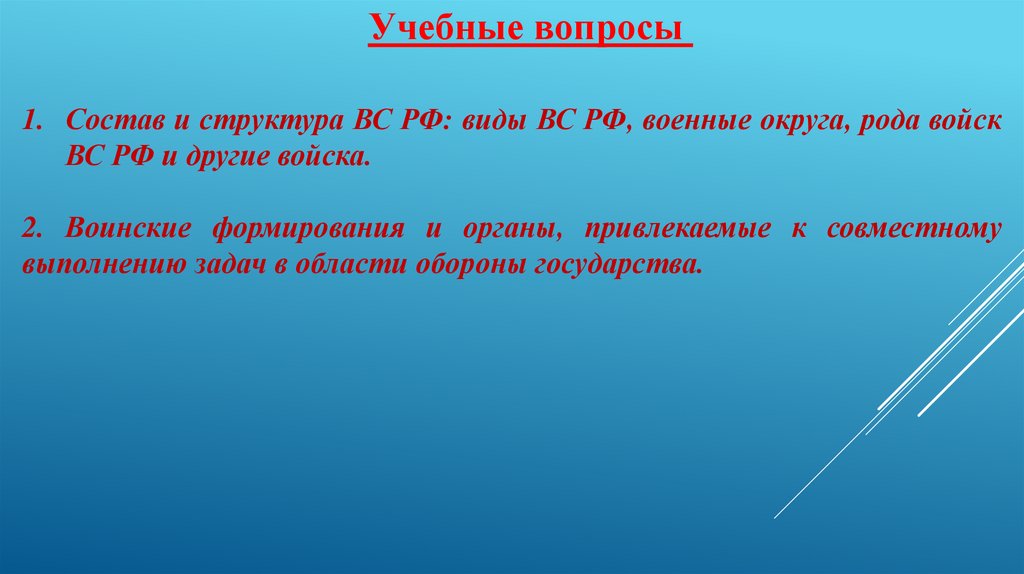 Учебные вопросы1. Состав и структура ВС РФ: виды ВС РФ, военные округа, рода войск