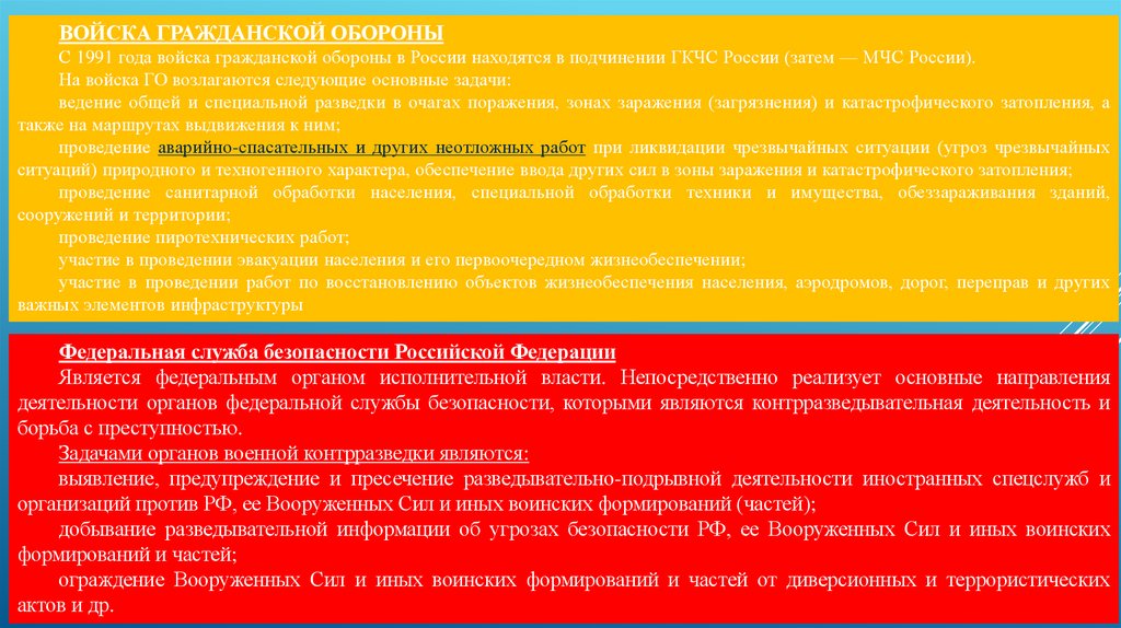 ВОЙСКА ГРАЖДАНСКОЙ ОБОРОНЫС 1991 года войска гражданской обороны в России находятся в подчинении ГКЧС России (затем — МЧС России).