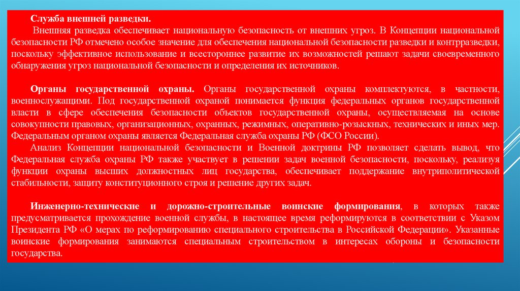 Служба внешней разведки.Внешняя разведка обеспечивает национальную безопасность от внешних угроз. В Концепции национальной