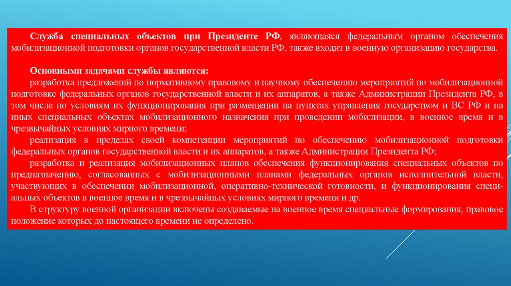 Служба специальных объектов при Президенте РФ, являющаяся федеральным органом обеспечениямобилизационной подготовки органов государственной власти РФ, также входит в военную организацию государства.