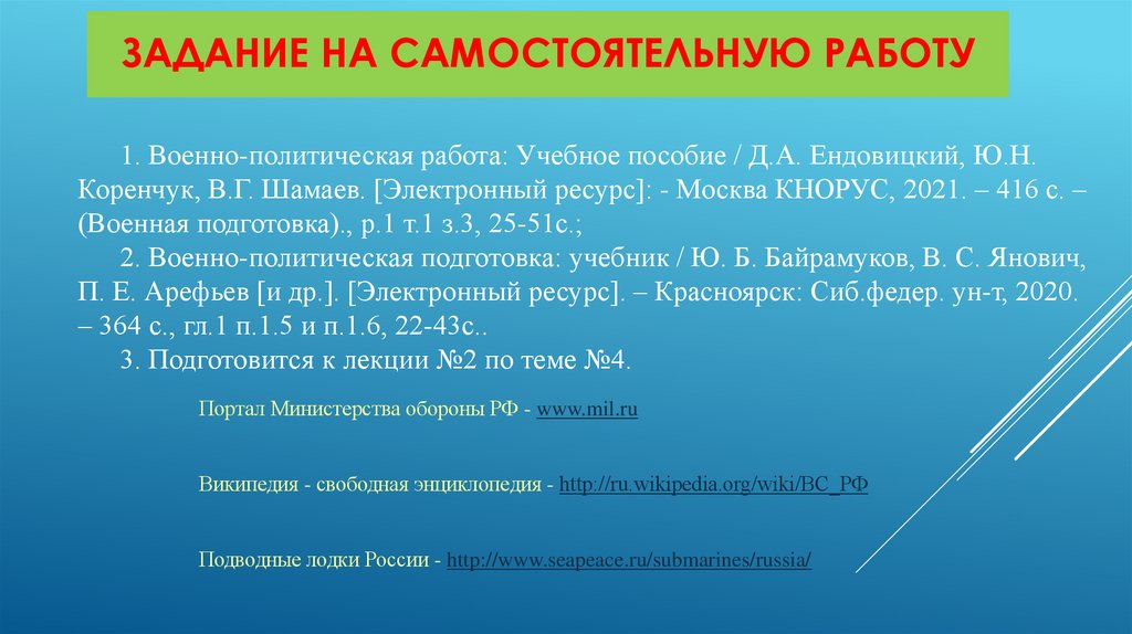 ЗАДАНИЕ НА САМОСТОЯТЕЛЬНУЮ РАБОТУ1. Военно-политическая работа: Учебное пособие / Д.А. Ендовицкий, Ю.Н.