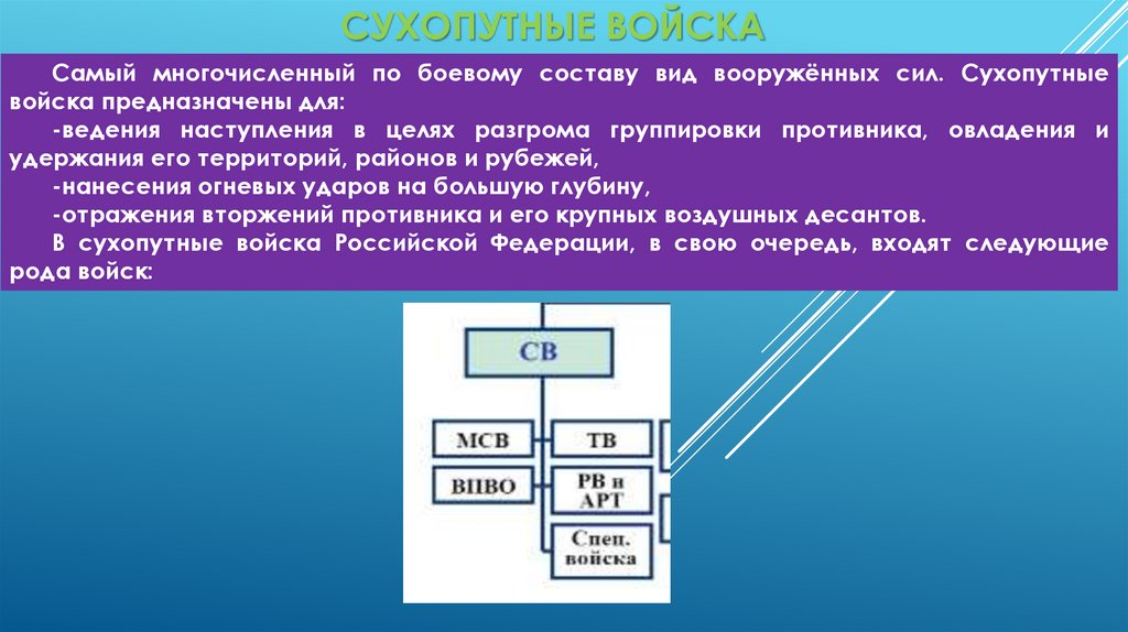 СУХОПУТНЫЕ ВОЙСКАСамый многочисленный по боевому составу вид вооружённых сил. Сухопутные