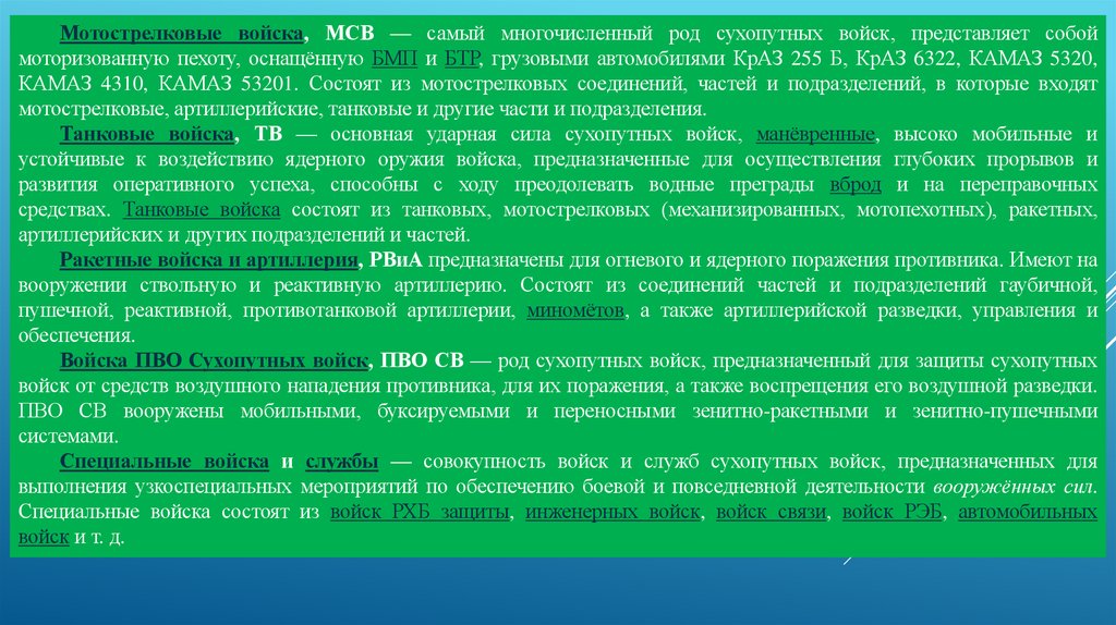 Мотострелковые войска, МСВ — самый многочисленный род сухопутных войск, представляет собоймоторизованную пехоту, оснащённую БМП и БТР, грузовыми автомобилями КрАЗ 255 Б, КрАЗ 6322, КАМАЗ 5320,