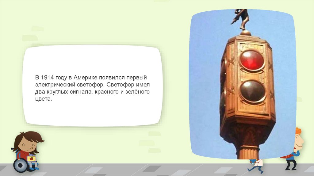 В 1914 году в Америке появился первыйэлектрический светофор. Светофор имел