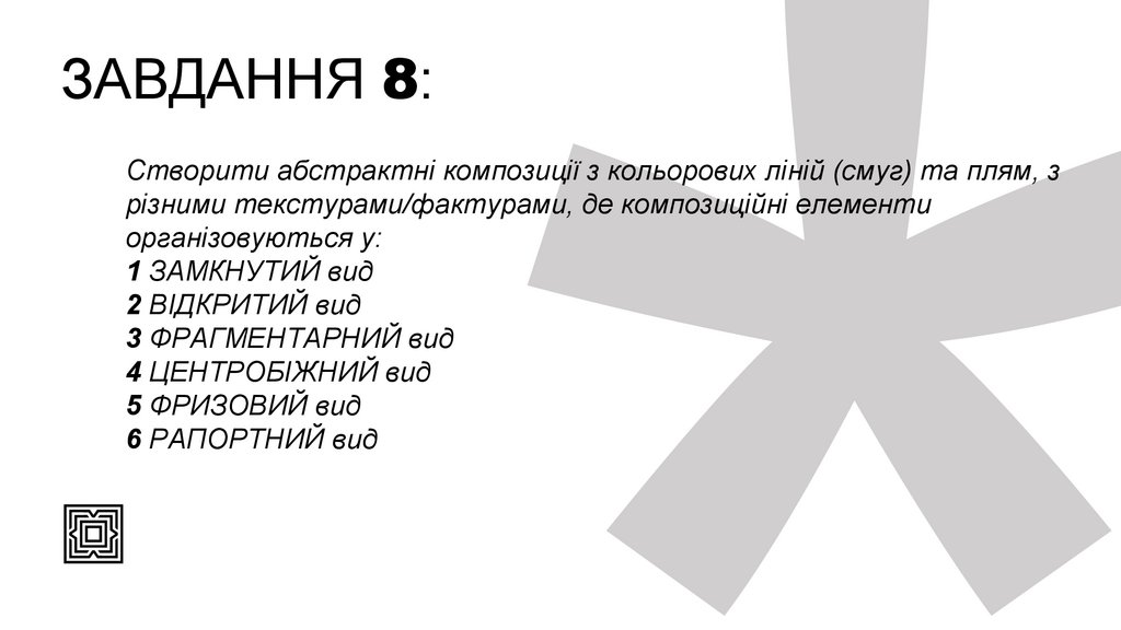 ЗАВДАННЯ 8:Cтворити абстрактні композиції з кольорових ліній (смуг) та плям, з