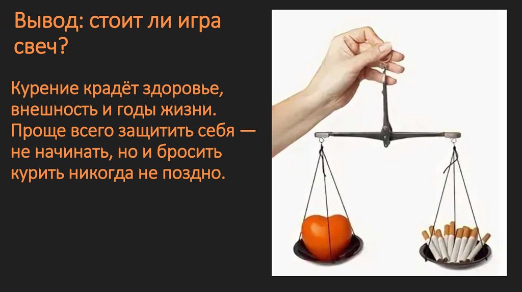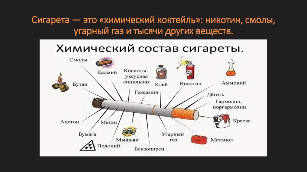 Сигарета — это «химический коктейль»: никотин, смолы,угарный газ и тысячи других веществ.
