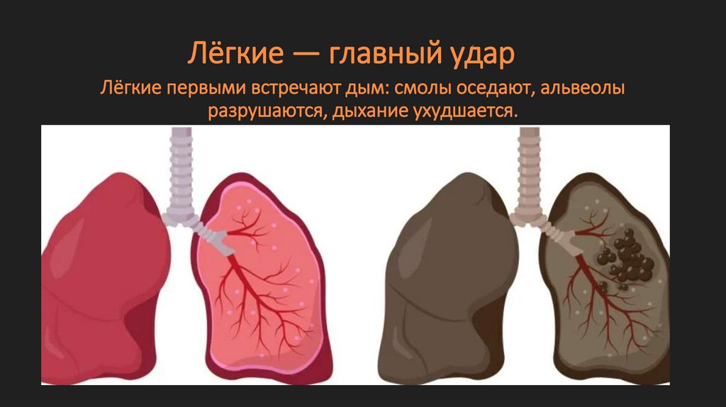 Лёгкие — главный ударЛёгкие первыми встречают дым: смолы оседают, альвеолы