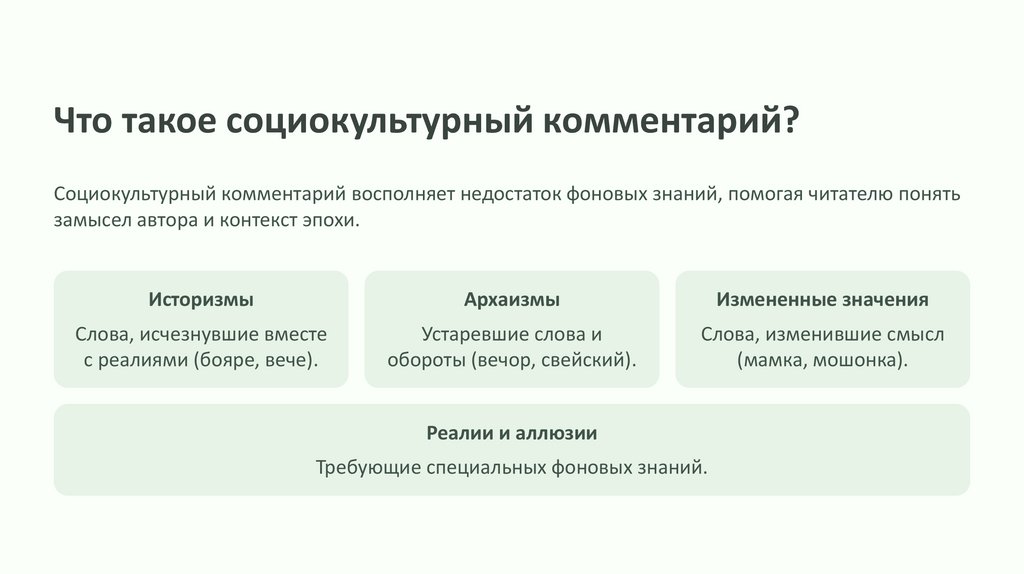 Что такое социокультурный комментарий?Социокультурный комментарий восполняет недостаток фоновых знаний, помогая читателю понять